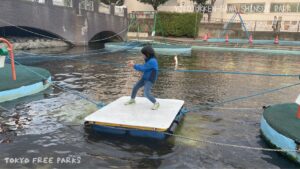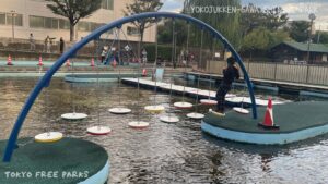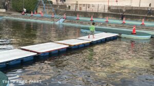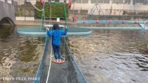 The aquatic athletics here can be enjoyed throughout the year. Despite being termed “aquatic,” the play equipment is not directly on the river; with a water depth of 25 centimeters, children of elementary school age and above can play independently, while younger toddlers can join with their guardians.
